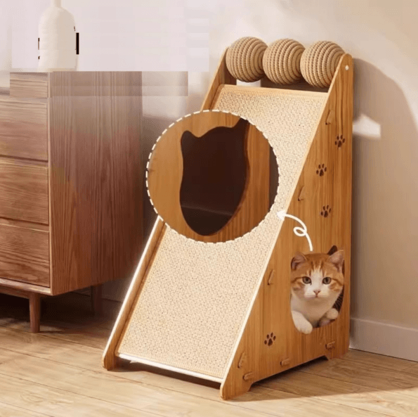 Multifunctional cat house with a scratch ramp, playful cat-head entrance, and cozy hiding spot. Designed with durable wood and sisal balls for interactive fun and healthy scratching.