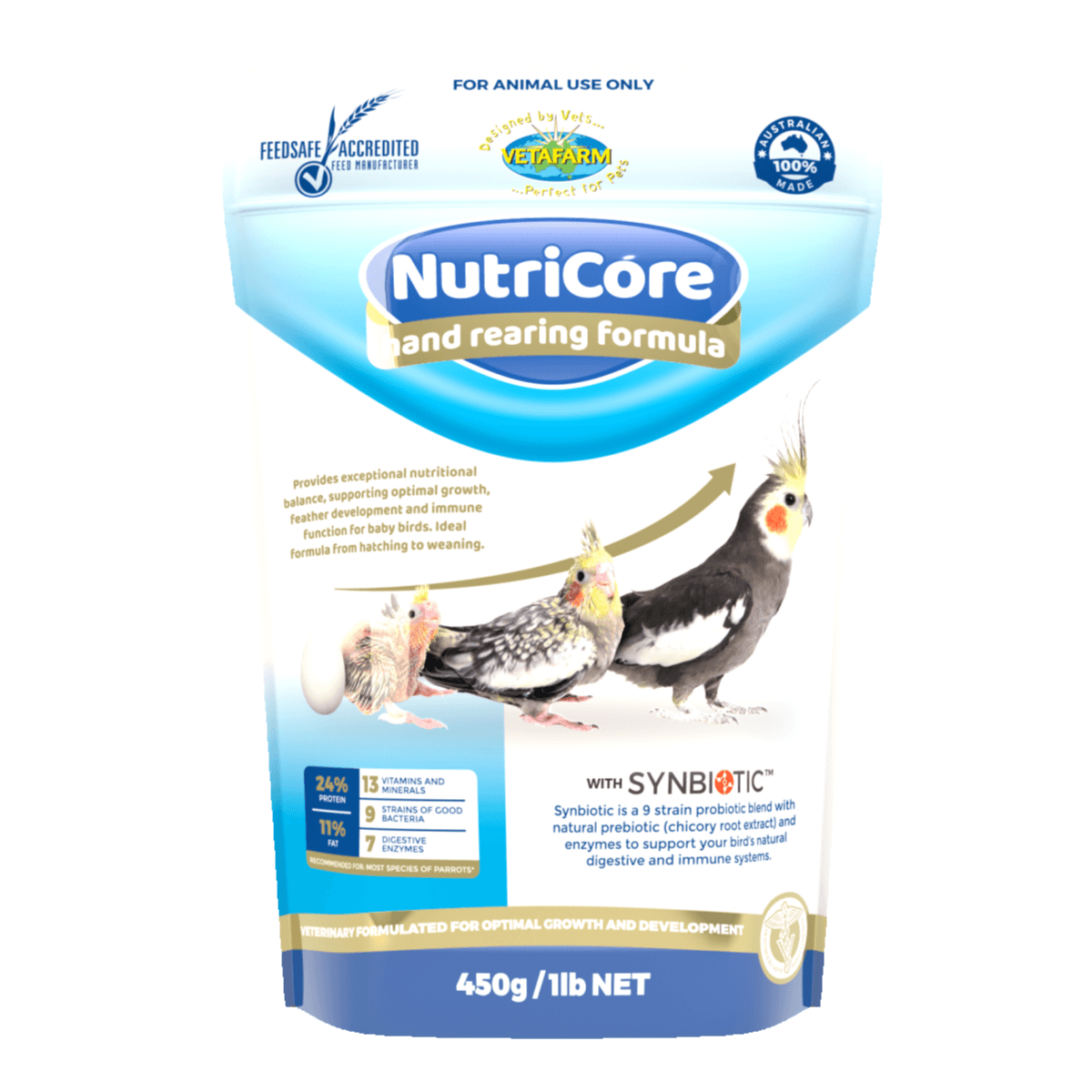 Nutricore Hand Rearing 450g is specially designed to provide exceptional nutritional balance to baby birds, ensuring optimal growth, feather development, and immune function. Ideal from hatching to weaning, this formula contains 13 essential vitamins and minerals, 9 strains of good bacteria, and 7 digestive enzymes. Veterinary formulated for the best growth and development, it is perfect for most species of parrots. Sensitive species such as African Grey Parrots, Black Cockatoos, and Hyacinth Macaws should be raised on Vetafarm Neocare for specific care.