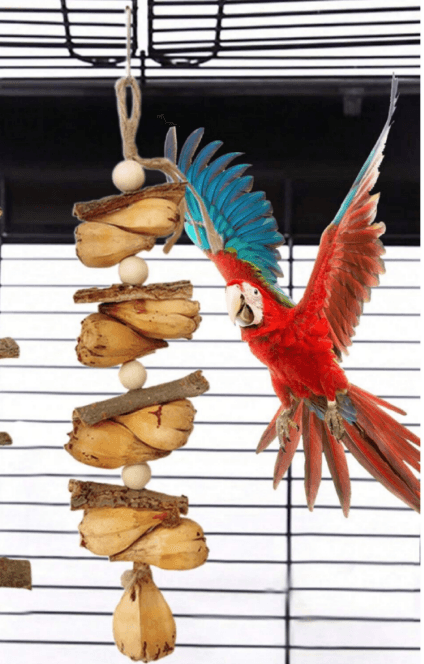 Natural bark toy for parrots. Fun cage hanger to beat boredom. Random color.
