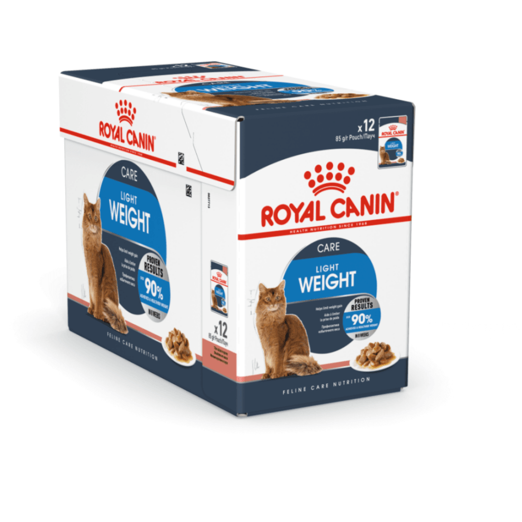 Royal Canin Feline Care Nutrition Light Weight Care Wet Food – Pouches 12 x 85g is designed to help maintain an ideal weight in adult cats. This premium wet food is formulated with a precise balance of nutrients, including high-quality proteins and low fat, to support healthy weight management. The delicious recipe is enriched with fiber to promote a feeling of fullness and reduce overeating. Each 85g pouch offers a fresh and nutritious meal, perfect for cats needing weight control without compromising on taste.