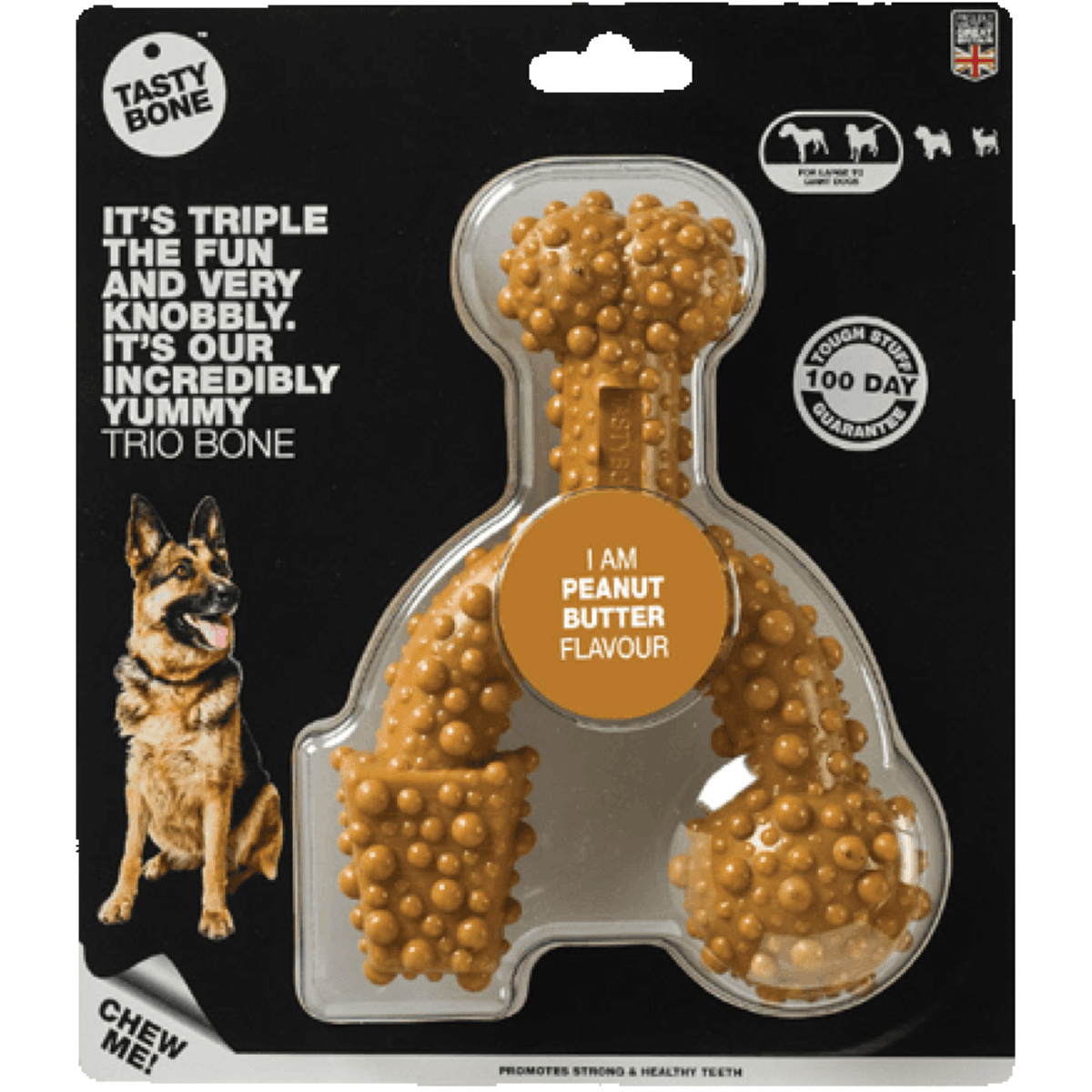 Triple the fun, triple the flavor! The TastyBone Nylon Trio for Large Dogs – Peanut Butter is packed with durability and irresistible taste. Made from 100% virgin nylon and tested on the toughest chewers, this knobbly bone is built to last. Infused with delicious peanut butter flavor all the way through, it keeps dogs engaged and chewing safely for longer. It helps strengthen your dog’s teeth and gums while supporting overall dental health. Perfect for toy to large dogs.